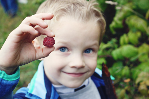We took the long way back to the house, bravely crossing our 3-inch wide creek with no one falling… but Dane freaking out enough and needing to be carried across (okay, okay, maybe it was 6-inches wide). And suddenly, to our delight, we discovered the raspberry patch still had perfect, juicy, amazingly sweet berries on it! We all stuffed our mouths and enjoyed each bite, extra delicious after the disappointment of the sour apples. There was even enough to gather hand fulls and take home to share with the Dads (I had an extra kid, remember) when they got home from work.