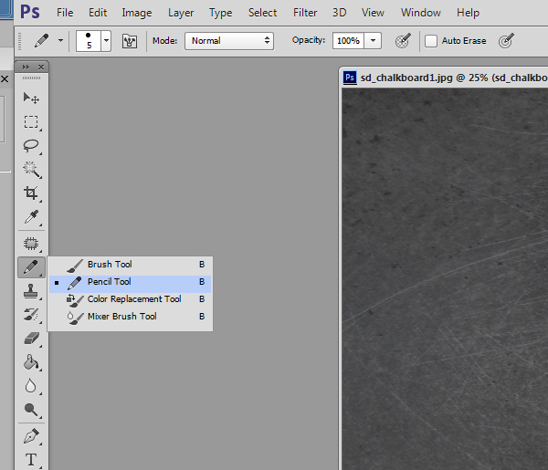 The Pencil Tool is grouped with the Brush, Color Replacement, and Mixer Brush Tools in Photoshop (image below captured in CS6). To find the Pencil Tool, we need to click on this group in the toolbox, then click on the Pencil Tool.