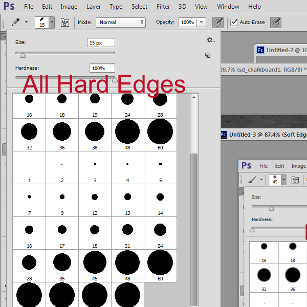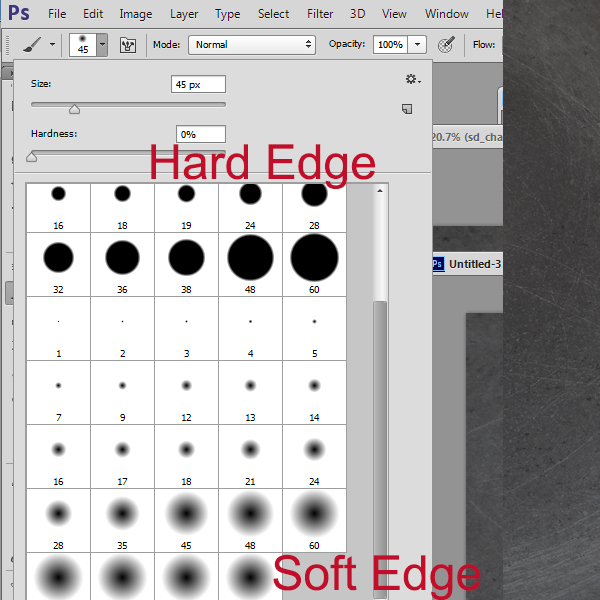 To test this, select your Brush Tool, and then open your Brush Preset Picker. In the image below you will see both hard and soft edge brushes.