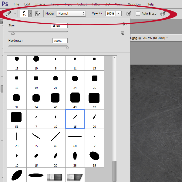 Once you select the brush that you would like to use, you may make changes in Blending Mode and Opacity in the top Menu Bar, if you wish.