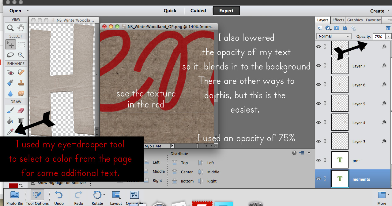 I dragged the letters I needed onto my page, arranged them and added a drop shadow to them. Next, I’m going to add a bit to the title with a font. I chose the font I wanted, used my color picker to choose a color from the page, a nice red, and typed my words. I then lowered the opacity of the font layer a little (to 75%) so that you could see some of the texture through the words.