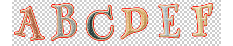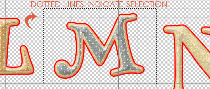 I like to apply a 10-pixel stroke around the letters on an alpha sheet before selecting them; this makes the letter boundaries easily visible, reducing the possibility of accidentally cutting off any part of the letter. I do this by applying a Stroke Photoshop Style I created for this purpose, but any Stroke Style will work just fine.