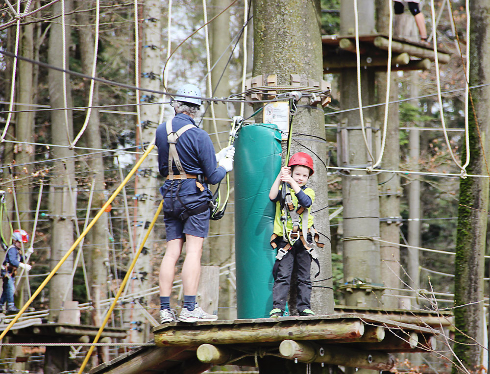On Thursday we rounded up our friends and took them to our favorite Freizeitpark (free time park). It has so much to do! There’s mini golf, pitpat, a playground, kid-size ATVs, segways, bow-and-arrow shooting, geo-caching, more bungee-cord trampoline, a biergarten (YAY!) and our very favorite… a ropes course! We have been coming here since our move to Germany in 2009, and we are well-known to the staff. I feel like Norm walking into a bar.