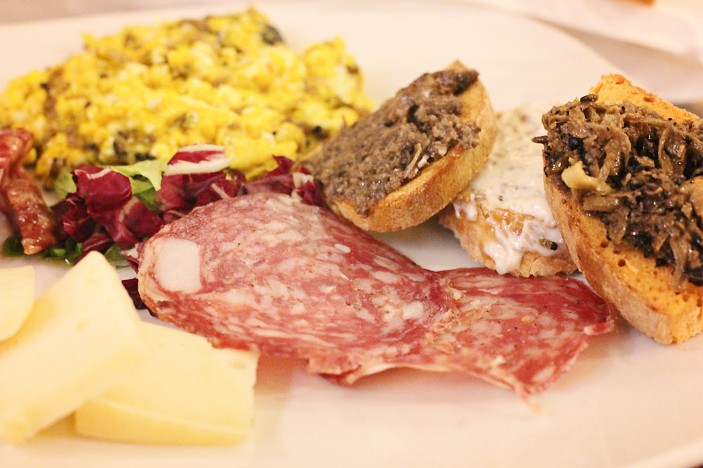 The appetizer was a mixed platter of cold cuts, scrambled eggs with a hint of truffles (with a warm yolk as sauce, to die for!), truffle bruschetta and cheeses. I thought I’d tasted Heaven, until my plate came out. I have never, ever had a pasta that delicious in my life. Liberally sprinkled with beautiful truffles, every bite was a delight. The prices were incredibly reasonable, I think my lunch was 9 or 10 €, and I’d expected only a taste if truffles. Instead, every mouthful was filled with the wonderful, earthy saltiness that’s distinctive to a truffle. I cannot wax poetic enough. We had unwittingly found a gem.