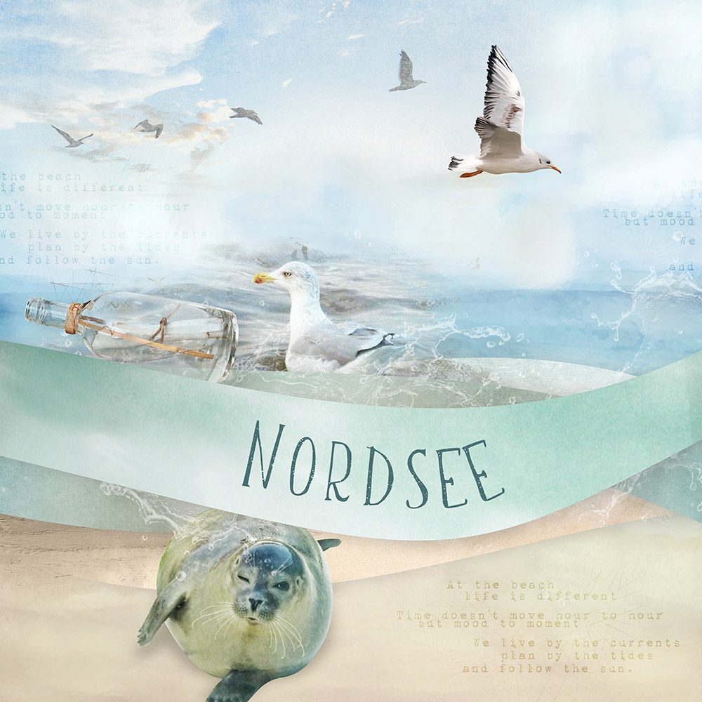 All papers and elements used in this layout are from the LAD collab Beachcombing, photo of swimming gull for mask and the seal are my own. Font used for title is Sunny Dino