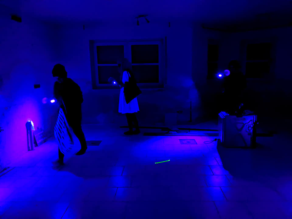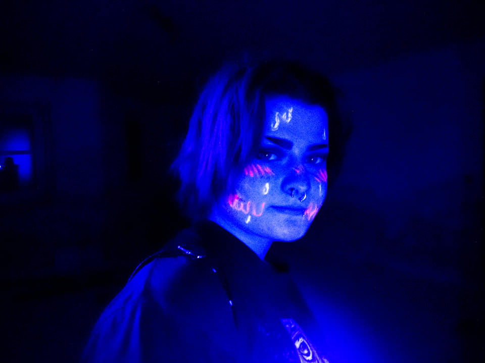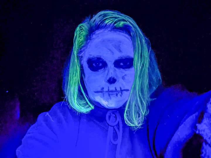 And then I saw on Facebook the suggestion to hide the Halloween candy. Like at Easter. Now Tess & Alana seemed interested. I kept thinking. And thinking about my costume. And then it hit me. Glow-in-the-dark face paint & black lights. Turn of the lights & have a mini rave (my inner 80’s child making a rare appearance).