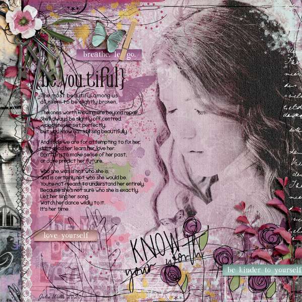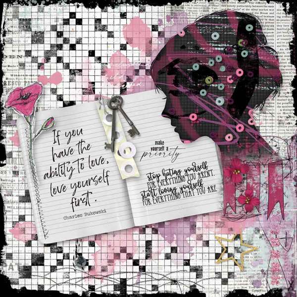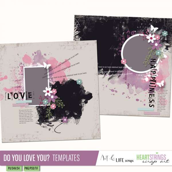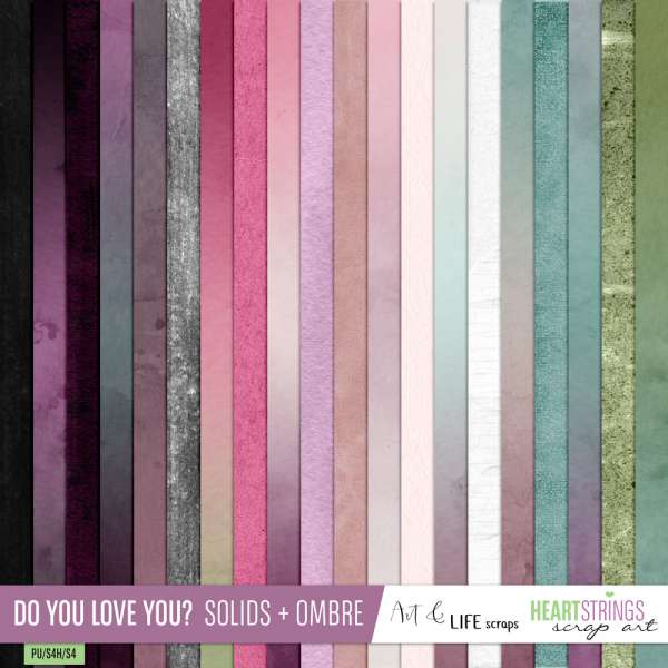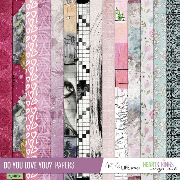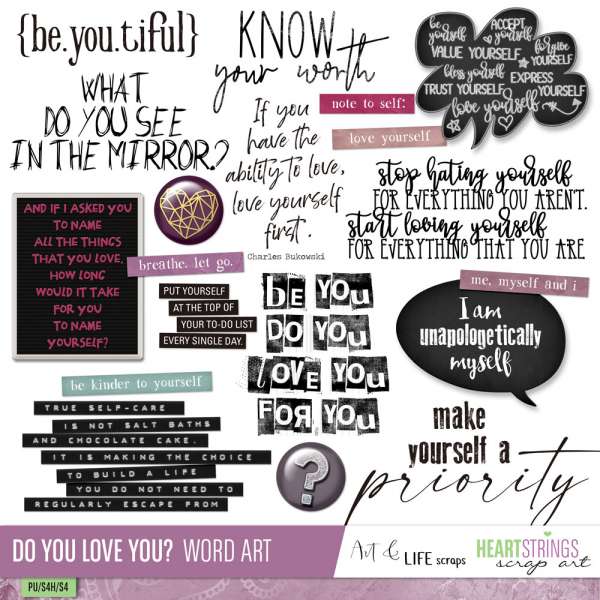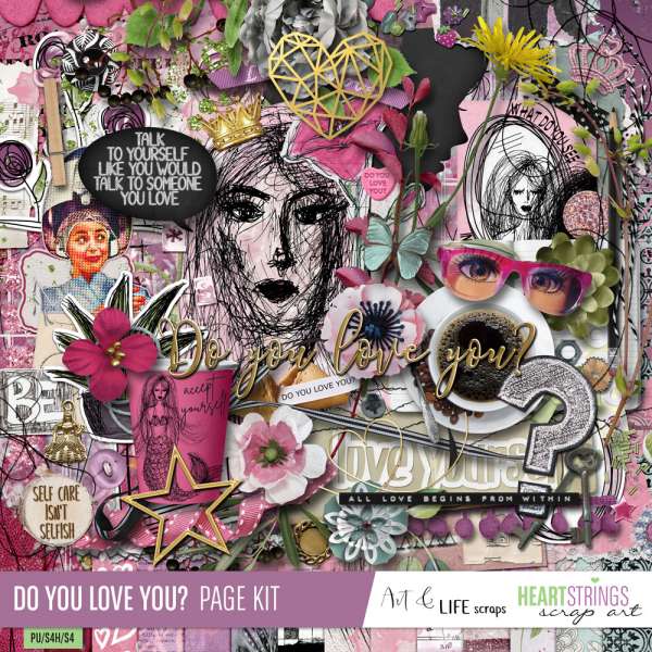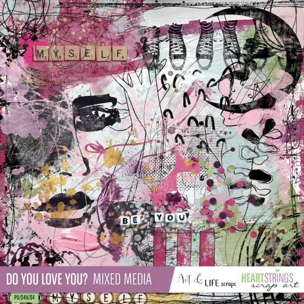 Do you love you? This art journal-style collection by Heartstrings Scrap Art and Cindy of Art & Life Scraps was designed to celebrate the beauty that is found inside each and every one of us. Use it to scrap your hopes and dreams as well as your day-to-day thoughts about life. Full of gorgeous arty bits as well as mixed media and traditional scrapbooking elements. The vibrant colours plus awesome grungy elements make this a very versatile collection.