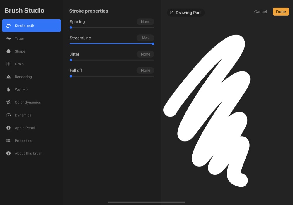 I start with a plain, round brush. I open Brush settings (double tap on the brush), and crank up the Streamline to the max, and dial down the Spacing to the minimum. This gives the brush a smooth, syrup-y flow. I made the brush size 100%.