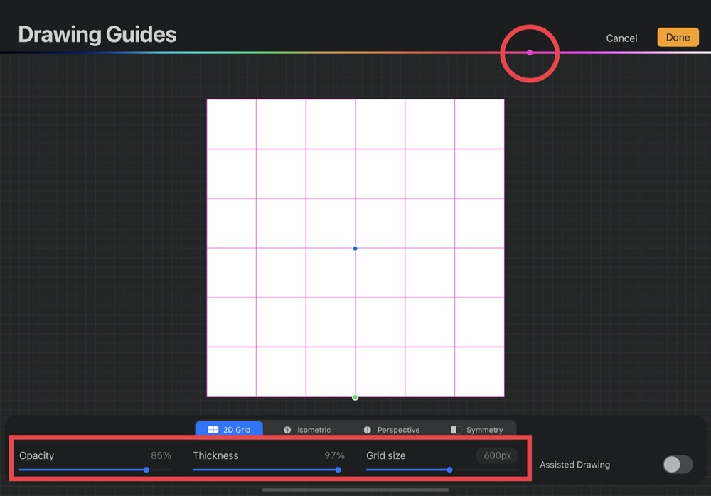 I choose a vivid color for contrast, and raise Opacity and Thickness. I tap to type in 600 px for the grid size, and tap Done.