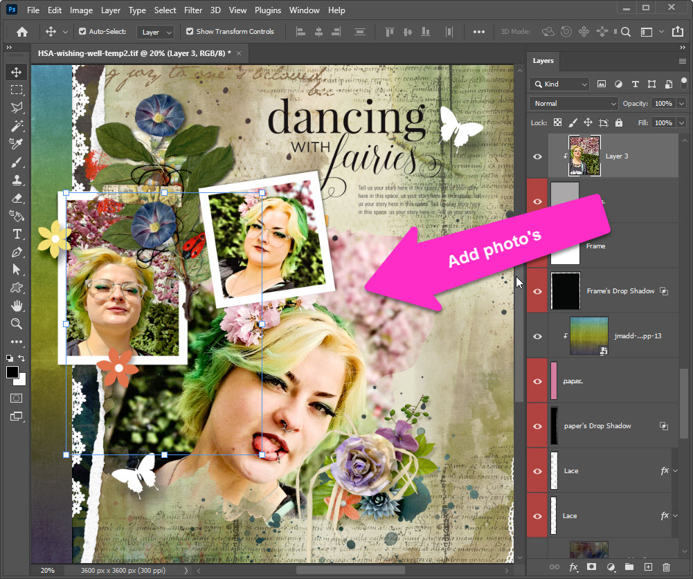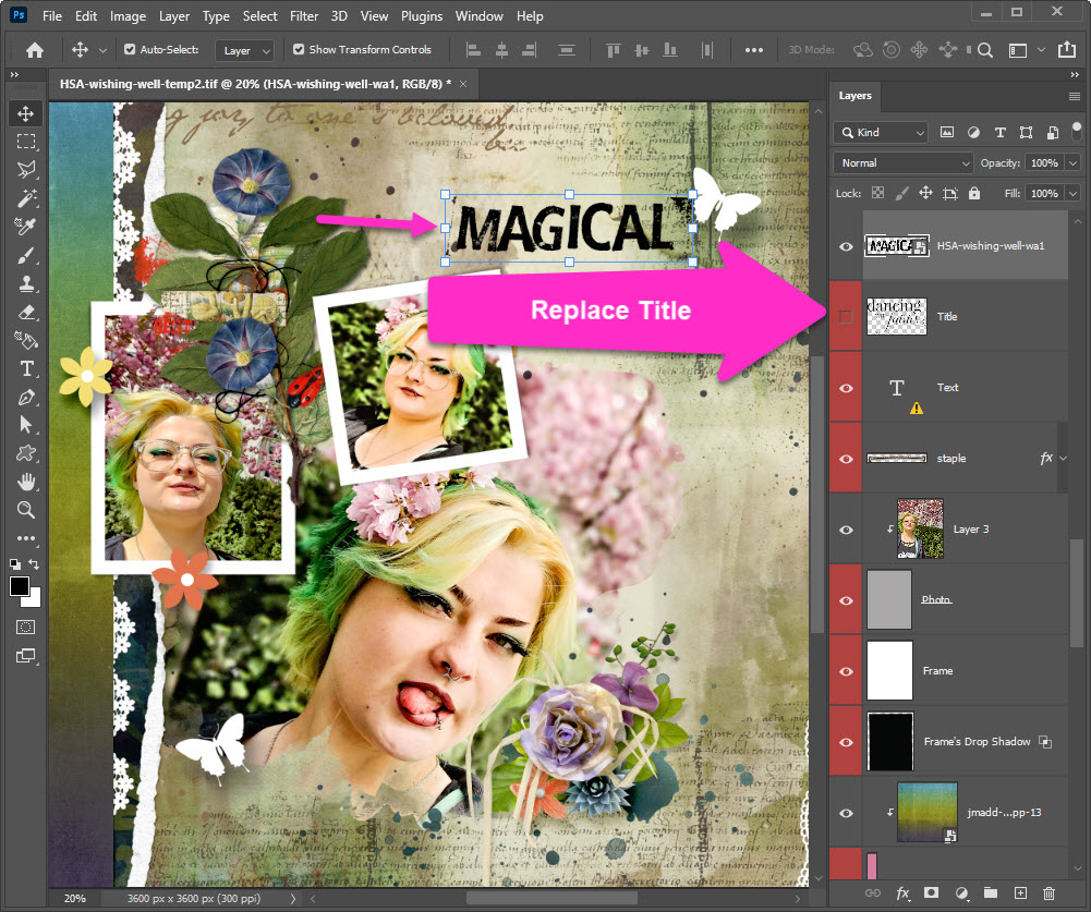 To be honest, I love the word art Bryony created for the template. I just don’t think it goes with Tess’ edgy look. Luckily Wishing Well is filled with fabulous Word Art packs, though, I am using a Word Art from Bryony’s Wishing Well {Faerie Folk} Arty by Heartstrings Scrap Art. Word Art can be found in lots of packs, including element packs, arty packs, etc.