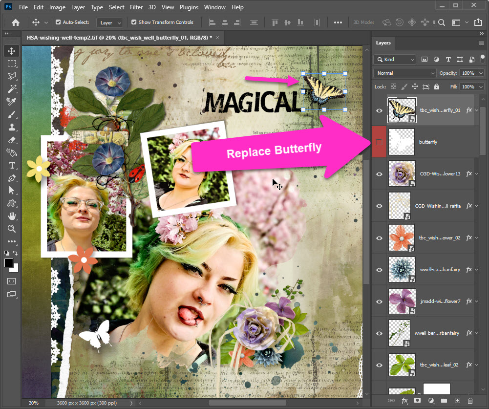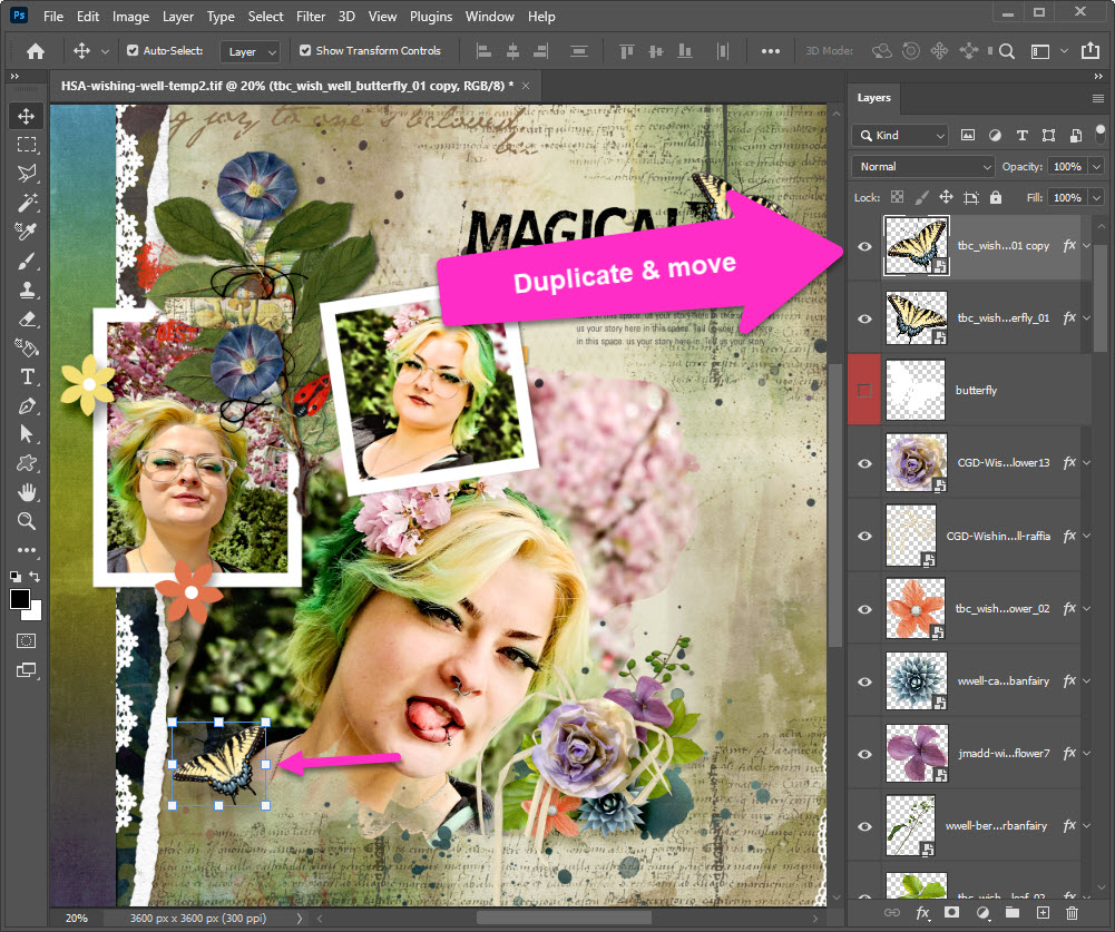 After you’ve updated the shadow, duplicate the butterfly & move it down to replace the other butterfly element in the template. Or actually, since there are so many awesome butterflies in this collection, replace the 2nd butterfly element with a different butterfly. The choice is yours!