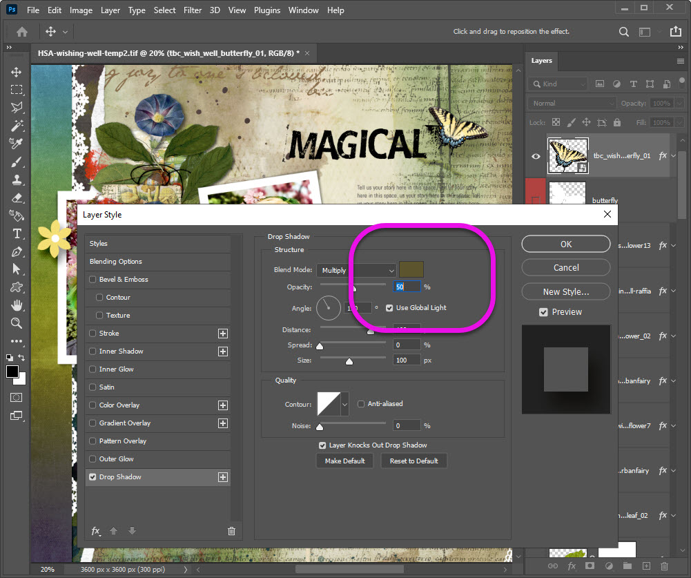 Remember how I changed the shadows on WIP: Wishing Well Day I? Remember to do it here too. I really like how Bryony sets her shadow styles for butterflies. The only thing I’m going to change is the color of the shadow itself, to make it lighter like the other shadows in my layout.